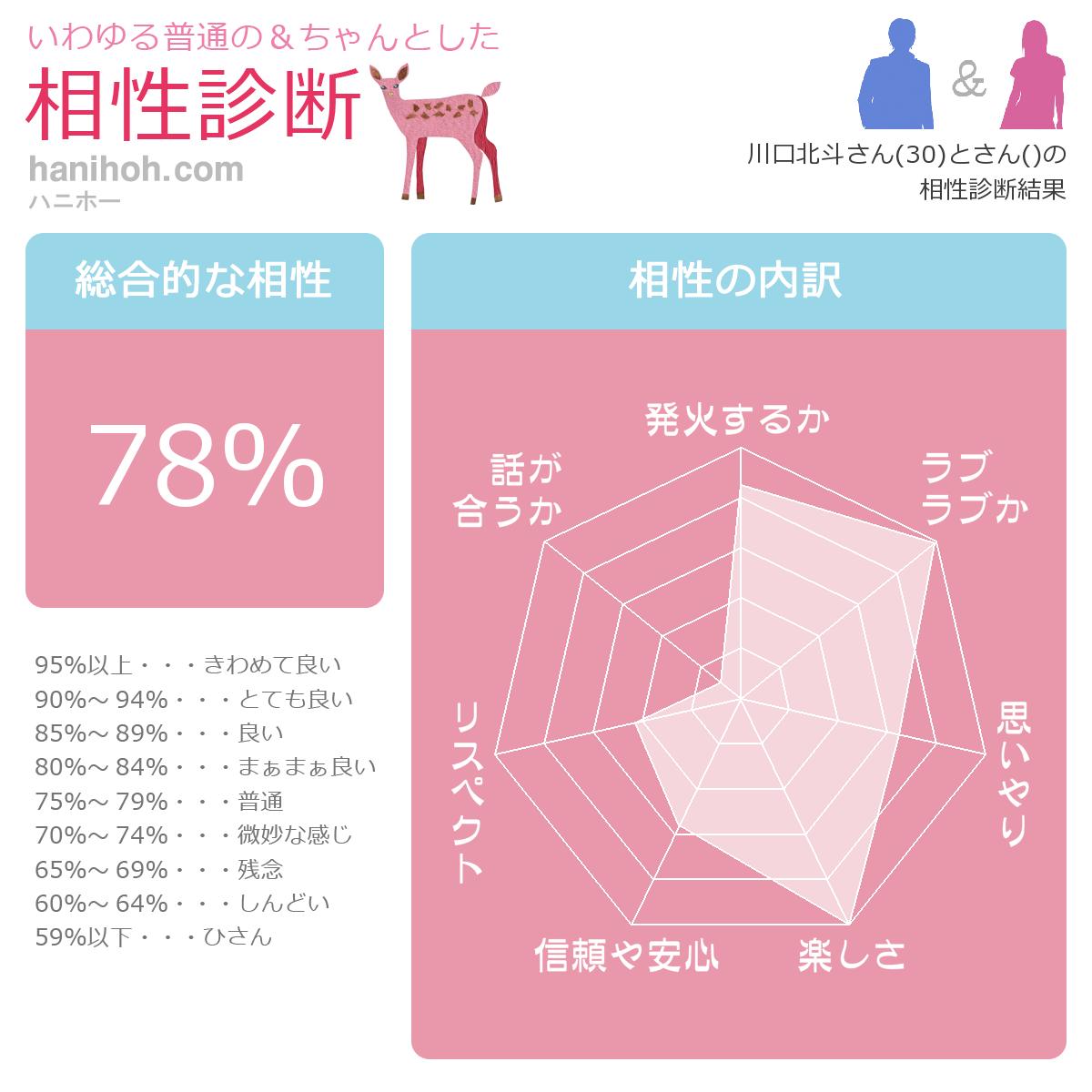 診断するまでもなく、このカップルは楽しいに決まっています。ひつじ雲さんもたこやき名人さんも明るいようですし、好奇心もあり、世界が広がりやすいようです。ただ一人一人が楽しい人ではありますが、もしかすると組み合わさったときに、うまく合わないかもしれません。